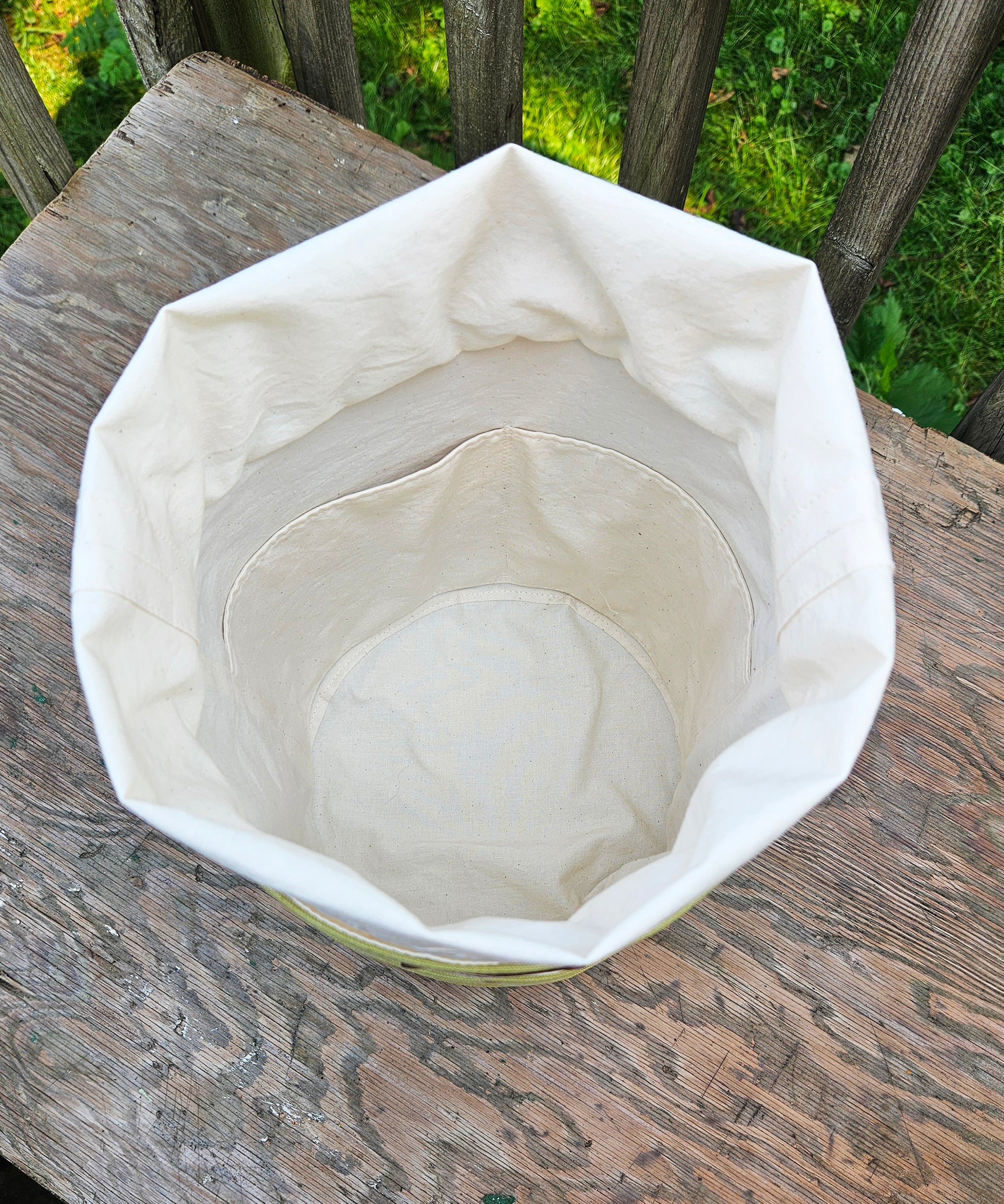 With it's circular base, you can fit lots inside this bag! It will take a small afghan or large sweater.
